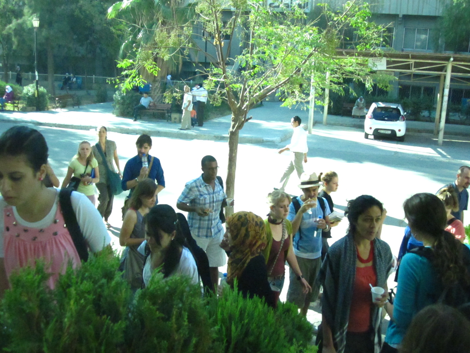 Semēħ steps in the class with that eternal semi-smirk of a confident approaching-middle-age Syrian woman, şabāħ l ķeir’s (Good Morning’s) us, and asks for the news. I didn’t read a damn thing from the newspaper yesterday… too caught up in grocery shopping and my other intense homework to translate yet another article about how great the Syrian president is, so I just sit up straight and try to appear like I’m on top of things. Sure enough, Semēħ picks a Korean woman in back, one of the most sheepish humans I’ve ever seen, to read her news. It’s read so quietly, no one understands a thing. That’s OK. It will come. Someday.